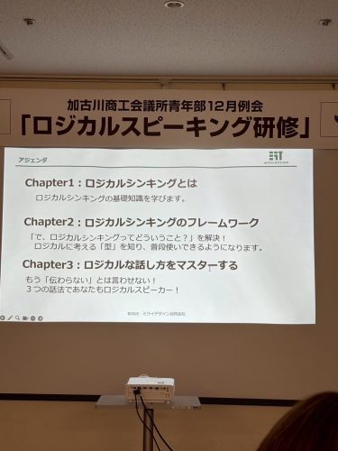 「どうすれば相手に分かりやすく伝わるか」を軸にしたロジカルシンキングのお話は、日常や仕事ですぐに実践できる内容で、話すことが苦手な私自身も大きな気づきを得ることができました。3時間という長時間の例会でしたが、飽きさせない構成とトーク力で、参加者からも「とても分かりやすかった」との声を多数いただきました。